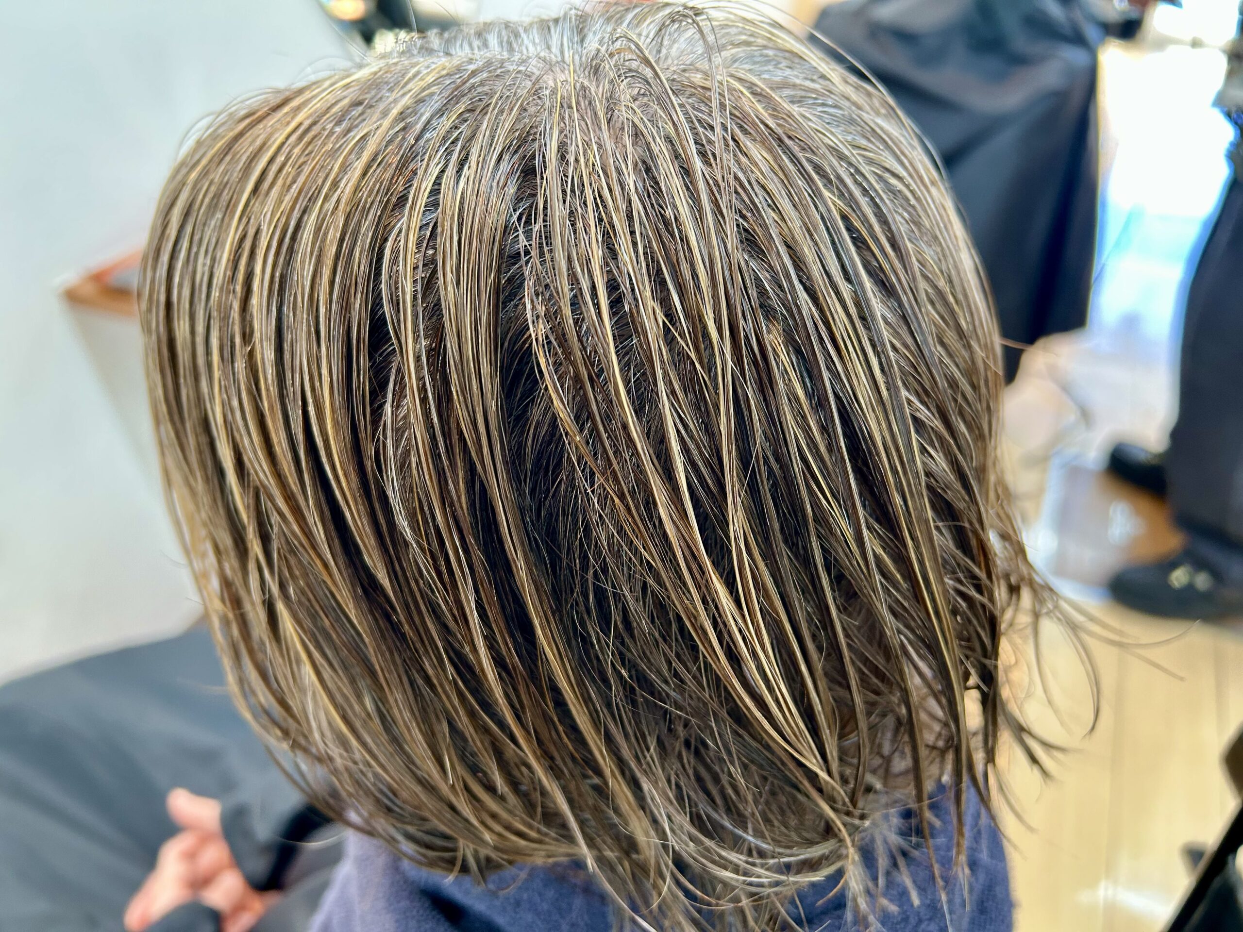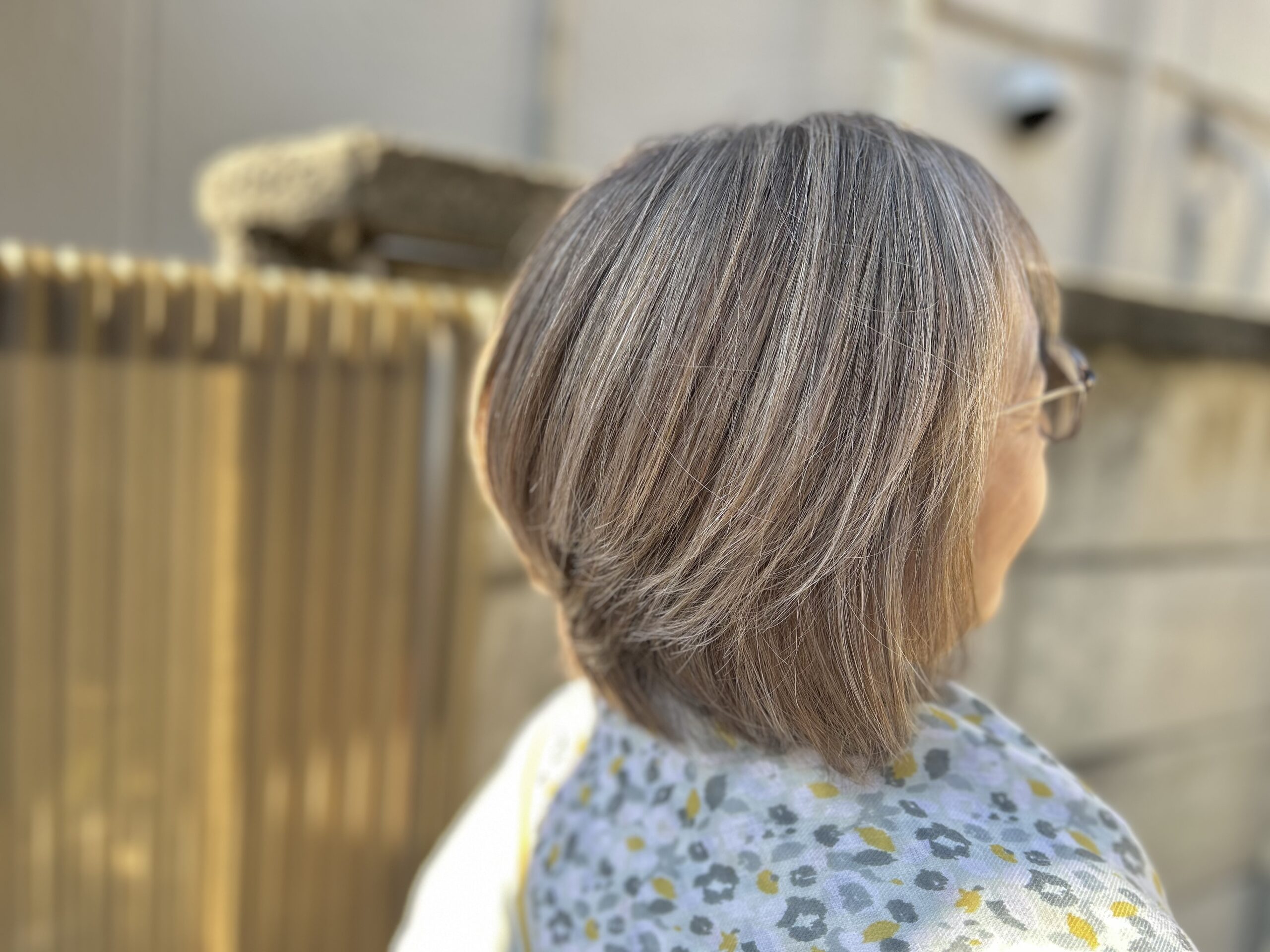 オンカラーで薄ーくアッシュベージュを紫シャンプーと混ぜて入れているので、白髪部分は全くわからないくらいナチュラルに仕上がりました❗️
