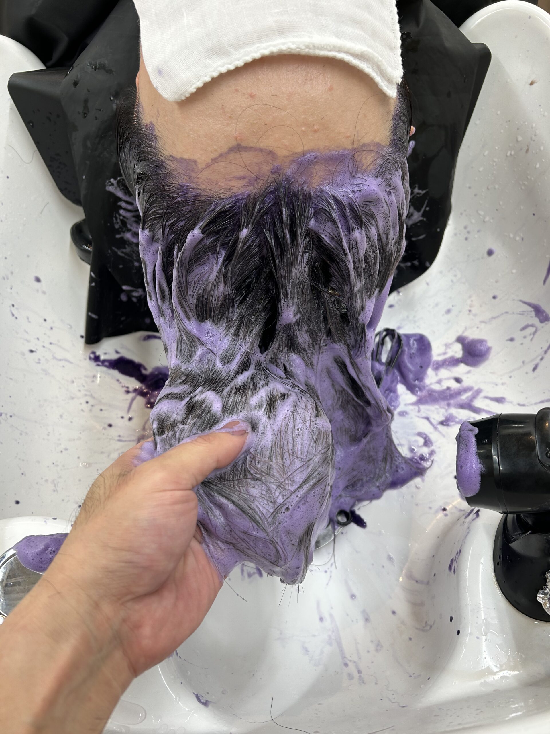 コチラは、シースルーハイライトでブリーチが完了した後のシャンプー時に、オンカラーとなるアッシュベージュのカラー剤と紫シャンプーを混ぜて作ったものでシャンプーしている様子です♪