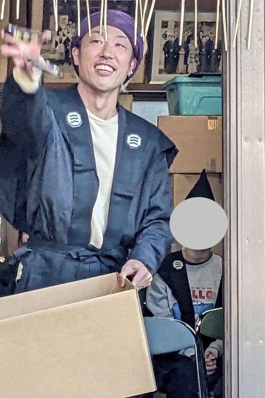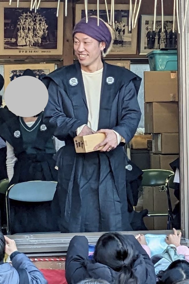 “かみしも”も着て、神社の本殿でお祈りして頂き、自分の母校である小学校の生徒たちが学校の終わる時間に合わせて、豆まき開始❗️